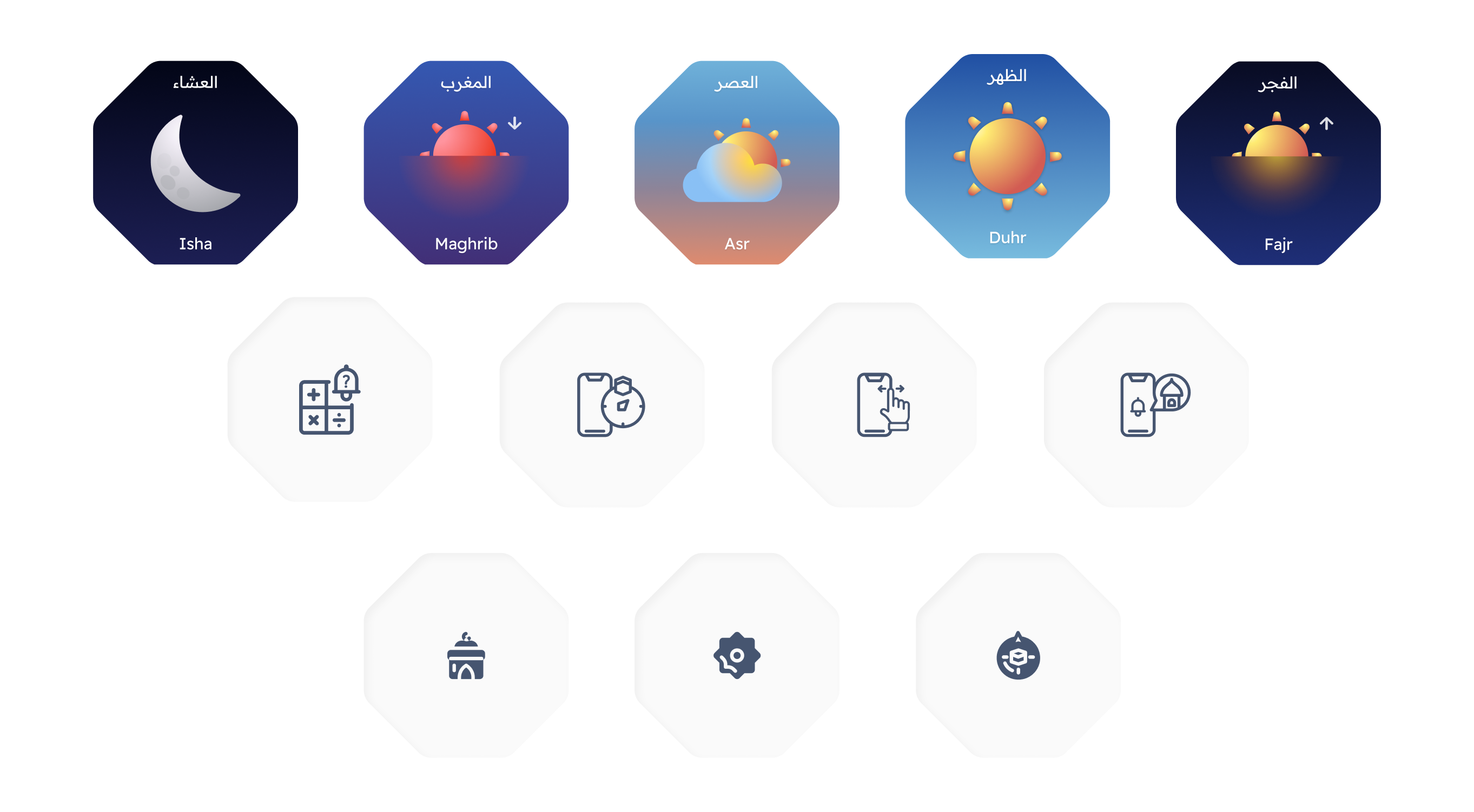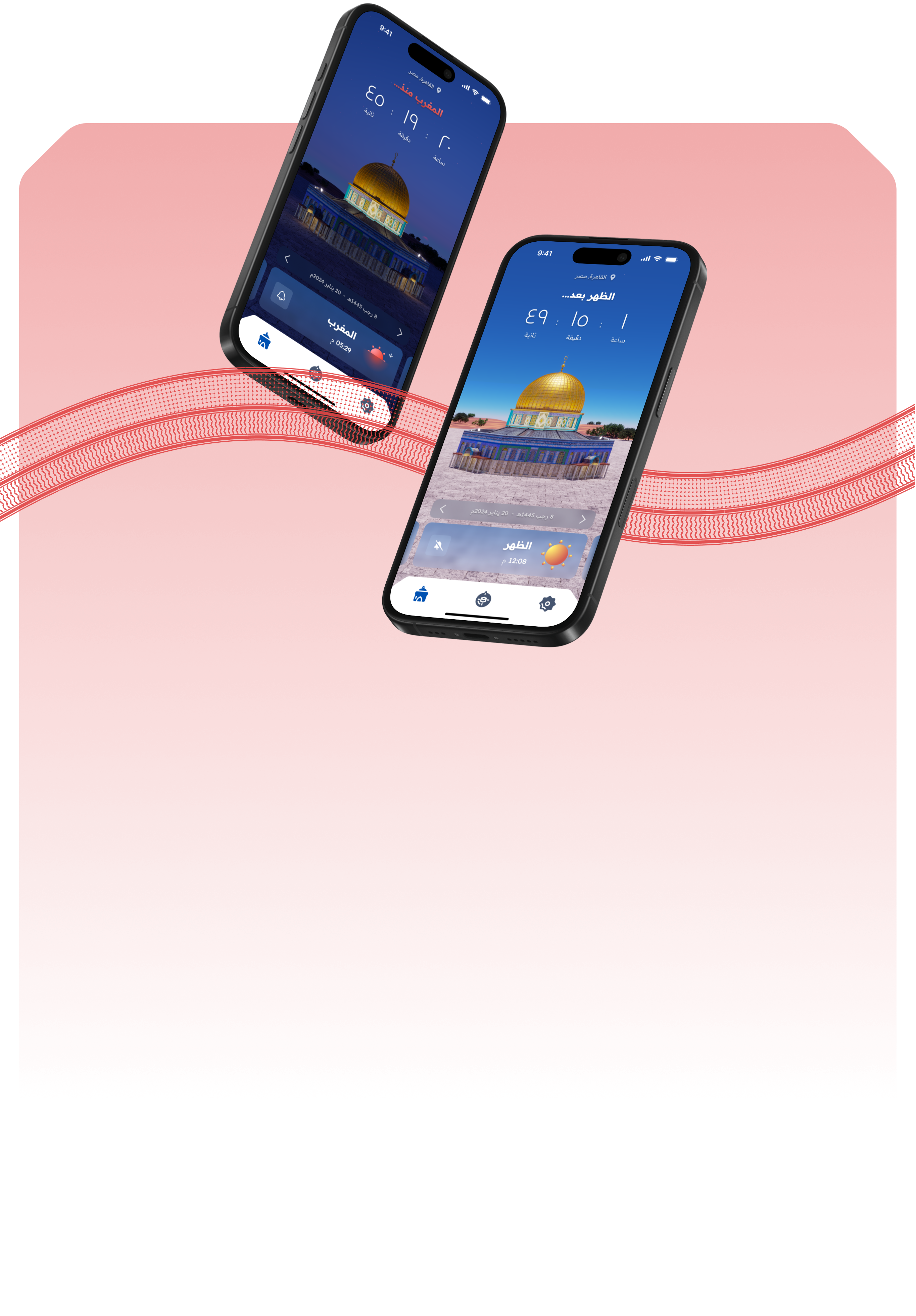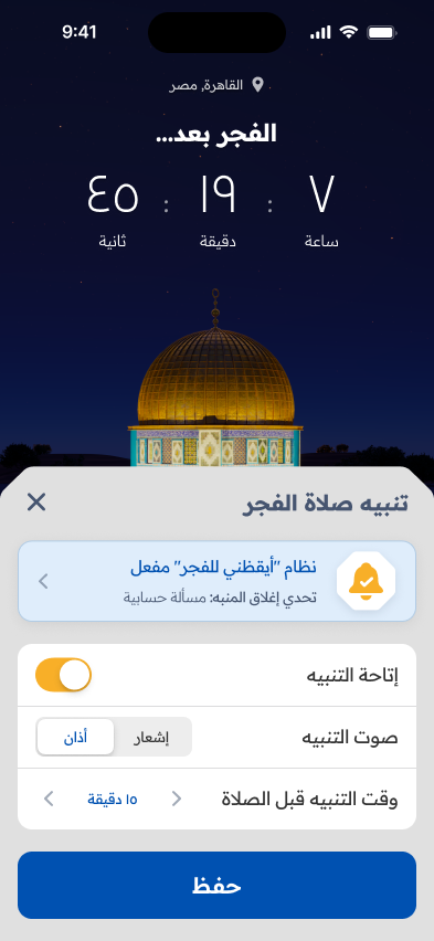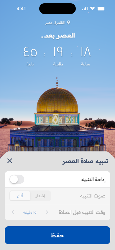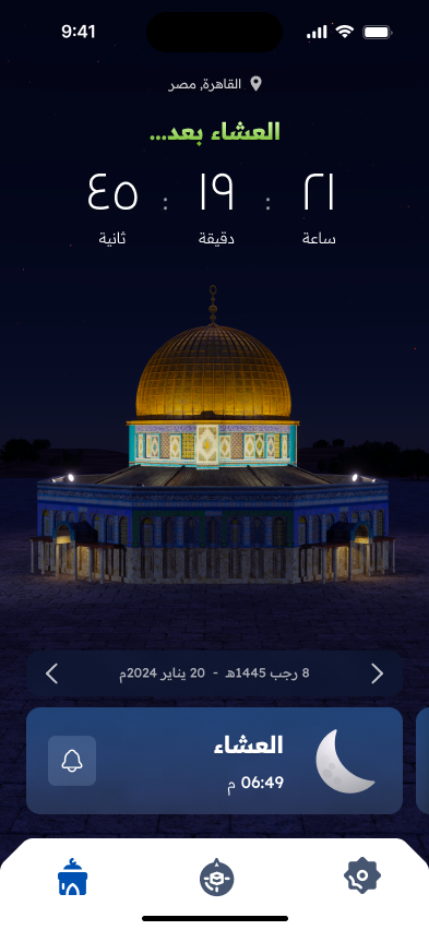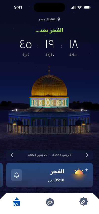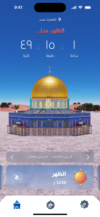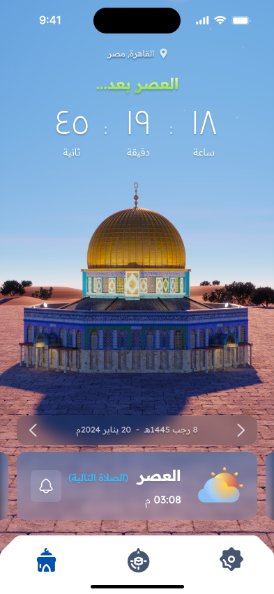 Unlike most prayer apps that rely on 2D illustrations featuring Islamic patterns, or mosque silhouettes, we wanted the design of this app to stand out. Our concept was to incorporate a 3D mosque set within a natural environment, with lighting changing to reflect the time of day for each prayer. A carousel allows users to navigate the five prayers, and the entire design responds accordingly. Inspired by recent events, we chose the iconic Dome of the Rock mosque as the focal point of this design, bringing its beauty and religious significance into the app’s visual experience.