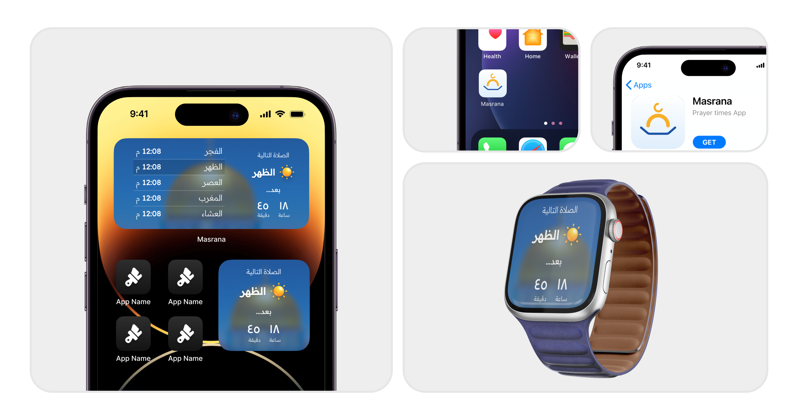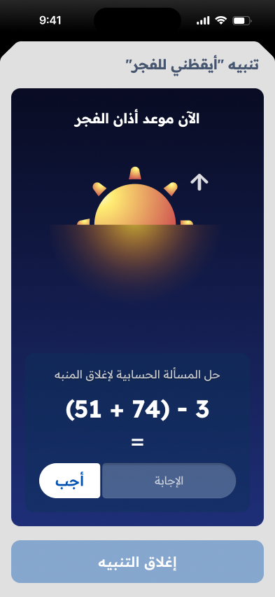 على عكس معظم تطبيقات الصلاة التي تعتمد على الرسومات الإسلامية ثنائية الأبعاد التي تتضمن الأنماط التقليدية أو صور الظلال للمساجد، أردنا لتصميم هذا التطبيق أن يبرز مع الحفاظ على الهوية الإسلامية. كانت فكرتنا هي دمج مسجد ثلاثي الأبعاد في بيئة طبيعية، مع تغير الإضاءة للإشارة إلى وقت الصلاة خلال اليوم. باستخدام شريط التمرير، يمكن للمستخدم تصفح الصلوات، فيتغير التصميم بالكامل بناءً على ذلك. متأثرين بالأحداث الأخيرة، كانت قبة الصخرة الخيار الواضح كمحور لهذا التصميم، مما يضفي جماله وأهميته على التجربة البصرية والدينية للتطبيق.